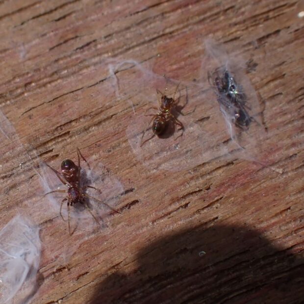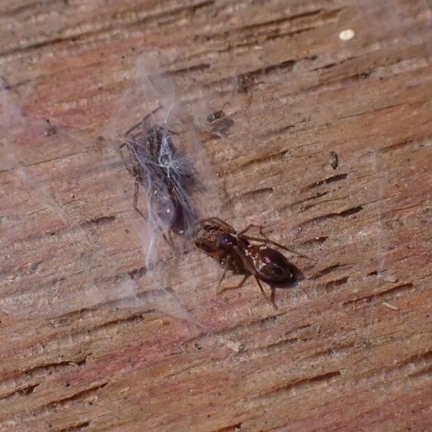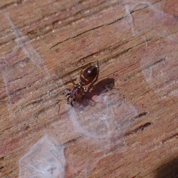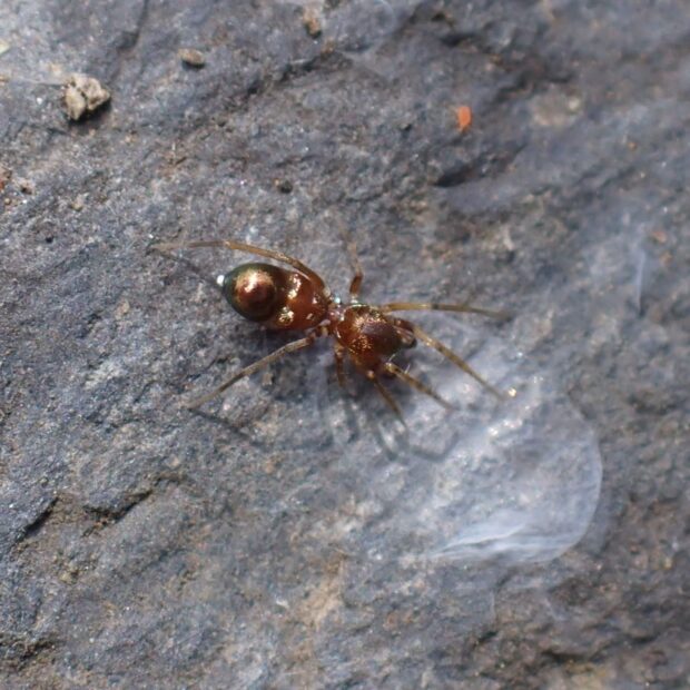ワシグモの仲間。 金色や紫色などに輝く美しいクモ。 田んぼや畑周辺の草地、 河川敷など、 日当たりのいい場所の石の下や地表で見られます。 名前の「ヒゲナガ」はオスの触肢が長いことに由来。
