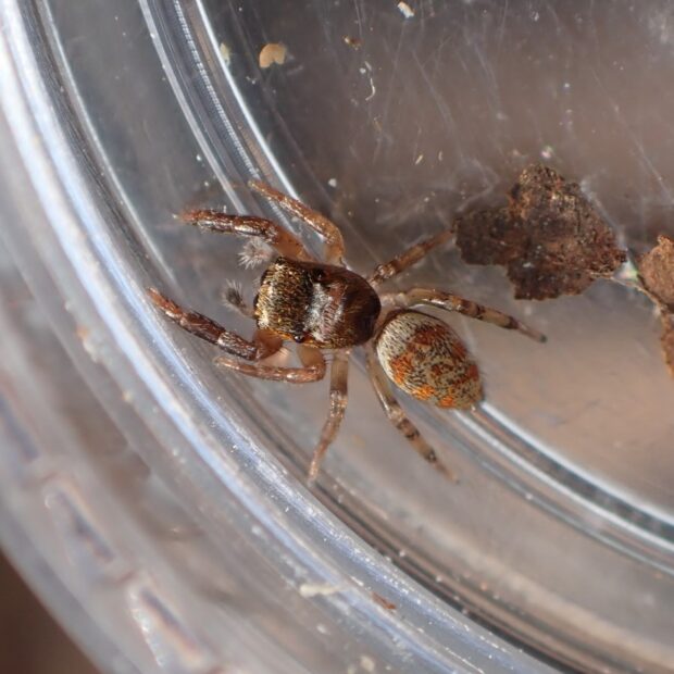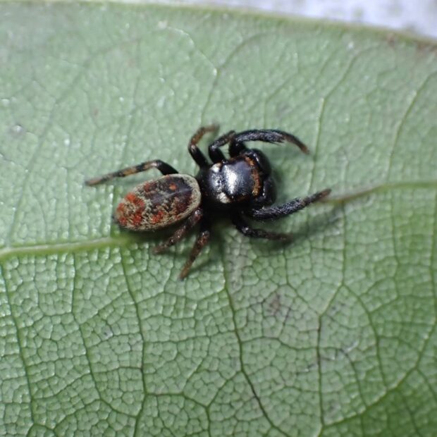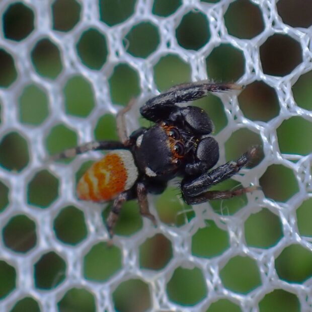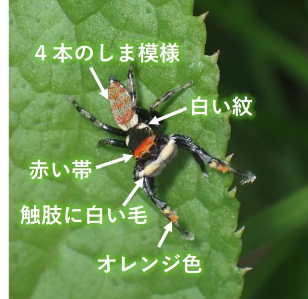 カラフルなハエトリグモ。 メスもオスも、 腹部にあるオレンジ色の4本のしま模様が特徴的。 草地や樹林地の下草などで普通に見られ、 歩き回って獲物を探します。