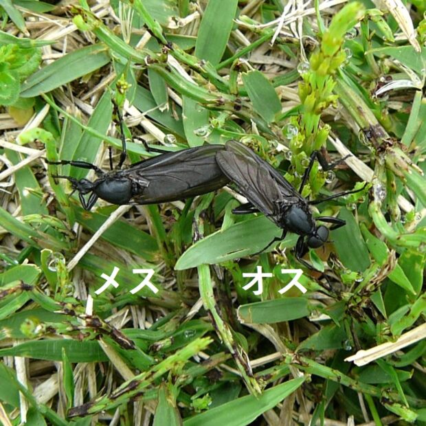 オスメスともに体もはねも黒いケバエの仲間。 オスは複眼が大きく、 メスは複眼が小さいです。 春、 公園や雑木林などで普通に見られ、 木の花などに集まります。 幼虫は毛の生えたイモムシ軍団で、 落ち葉などを食べる分解者。 地上で群れて冬を越します。