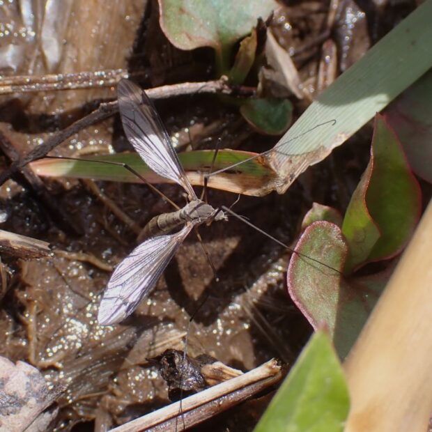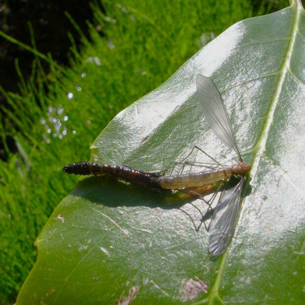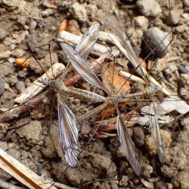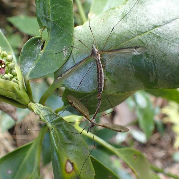 田んぼや畑に多いガガンボ。 成虫は2回、 春と秋に現われます。 幼虫が腹部を途中から切ったような形をしているため、 キリウジと名づけられました。 明かりにもよくやって来ます。