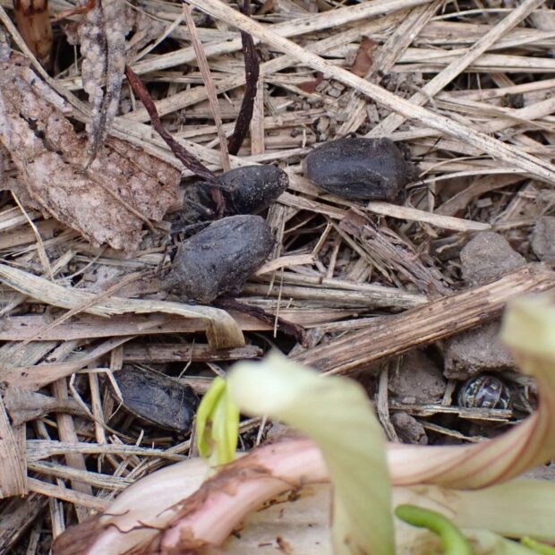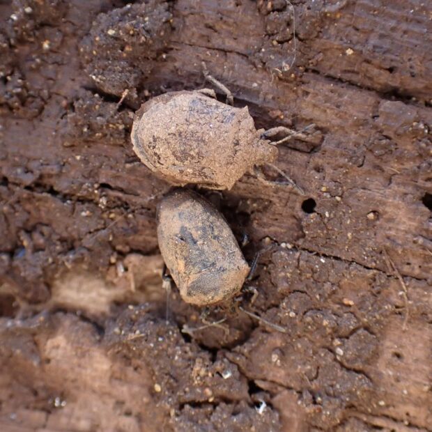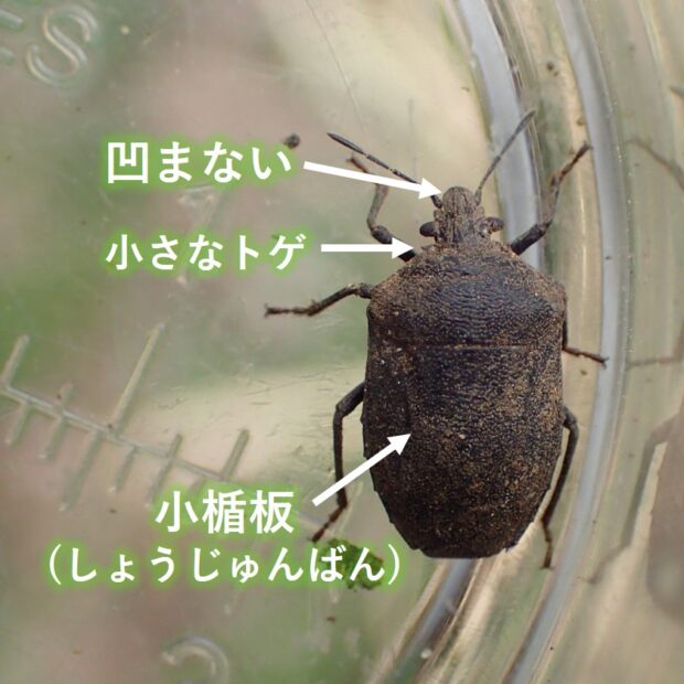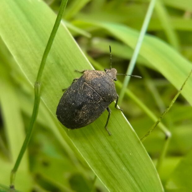 田んぼや湿った草地などで見られるカメムシ。 オオクロカメムシに似ていますが、 本種は頭部先端が凹みません。 イネやヨシなどのイネ科植物につき、 茎から汁を吸います。