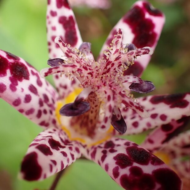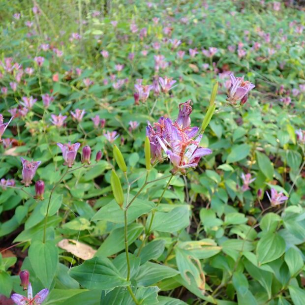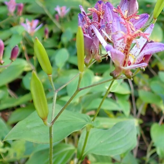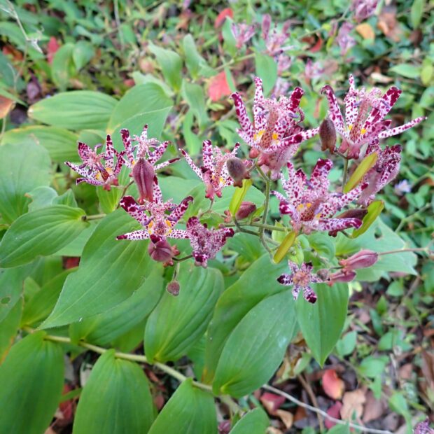 ホトトギスは花の形のおもしろさと花つきのよさで庭園によく植えられますが、 日本産ホトトギスとタイワンホトトギスとの交配種などが園芸的につくられて流通しています。