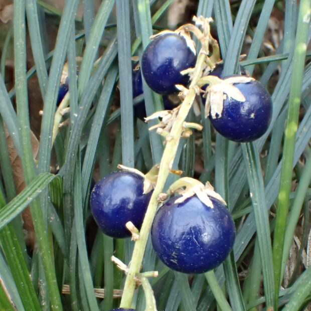 別名をリュウノヒゲ(龍の髭)。 細長い葉が髭のようなので名前にヒゲとつきました。 果実のように見える青い種子は、 ハズミ玉ともいい、 地面に投げ打つとよく弾みます。
