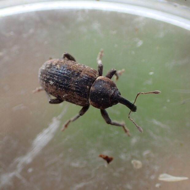 田んぼやその周辺で見られるイネゾウムシの仲間。 イネなどの展開前の新しい葉を食べ、 葉に穴をあけます。 はねに白い点があるものが多いですが、 点がないものもいます。 幼虫または成虫で越冬します。