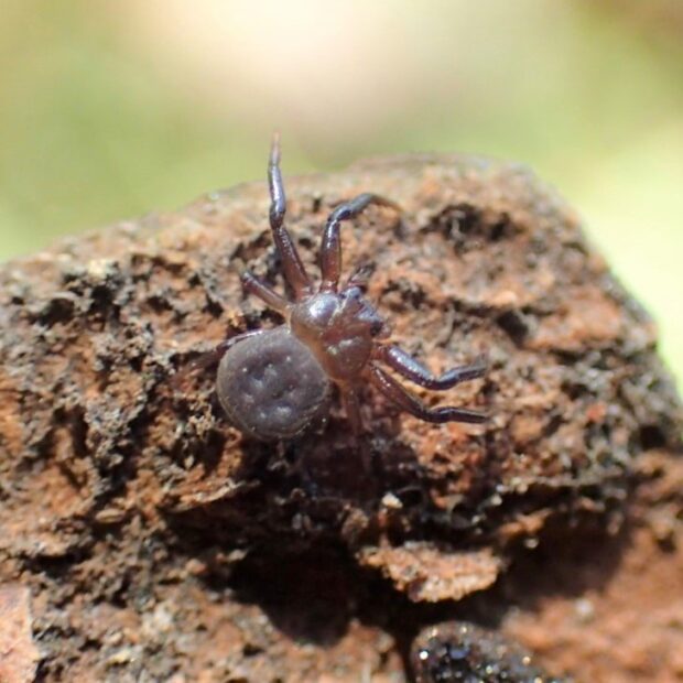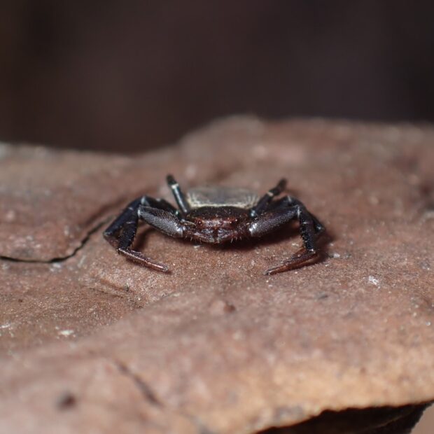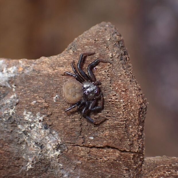 前の2対のあしが長いカニグモの仲間。 平べったい体をしており、 昼間は木の幹などのすき間や樹皮下で過ごし、 夜になると出てきて獲物を探します。 冬は樹皮の下で越冬します。