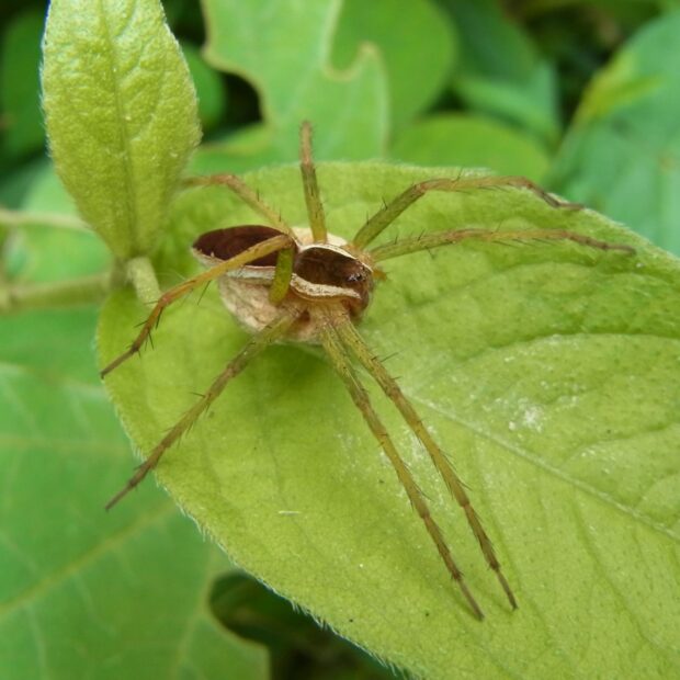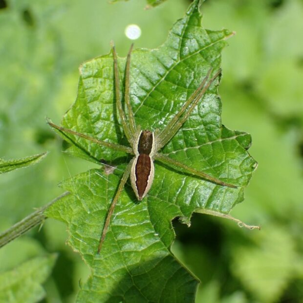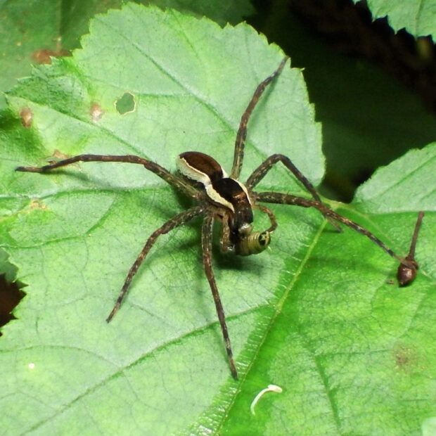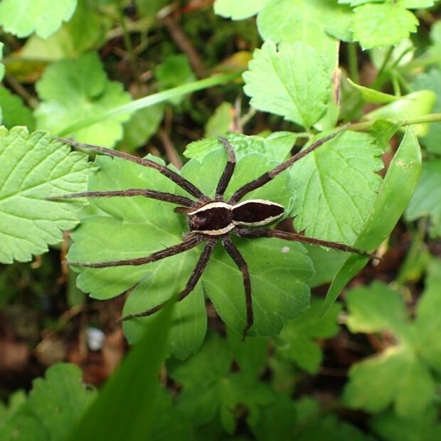 山に多いキシダグモの仲間。 林道の草木の葉の上にとまり、 獲物を待ち伏せします。 背面には白で囲まれた幅広い赤褐色の帯があります。 似ているハシリグモが数種類いますので識別には注意が必要。