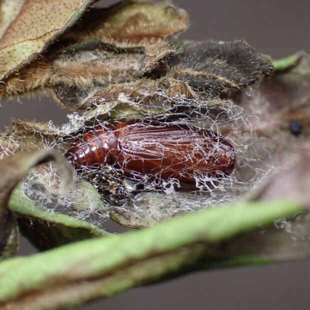 • オス。 前ばねに茶色の縁どり、 目立つ紋がある。