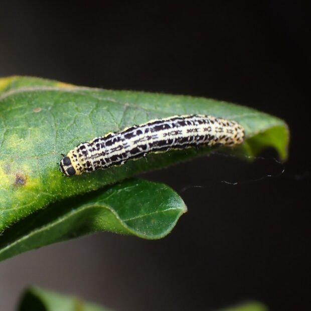 黄色いはねに紋があるエダシャク。 色や模様は変異がありさまざまです。 幼虫はスイカズラの仲間の葉を食べるシャクトリムシ。