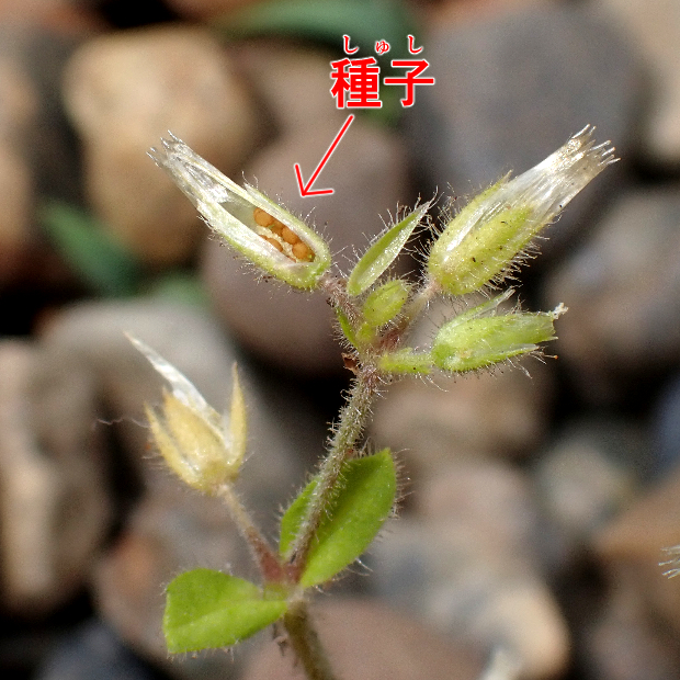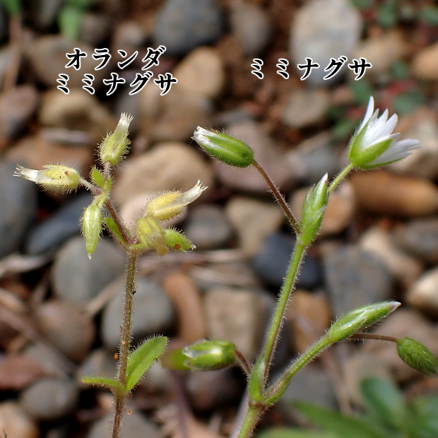ミミナグサは①茎先に花をまばらにつけ、 ②花の柄が長く、 ③種子は径1mmほどとオランダより2倍くらい大きく、 ④花の時期は5月くらいとやや遅めです。