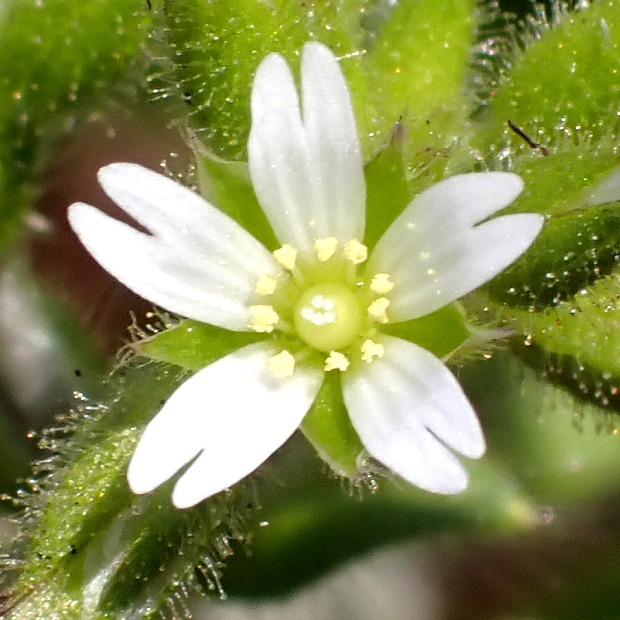 市街地でもごく普通に見られる草花。 花は白くて小さく、 全体にねばついた毛が多いので、 触るとフワフワねばねばします。 名前の耳菜(ミミナ)は、 葉の形がネズミの耳に似ていることが由来です。