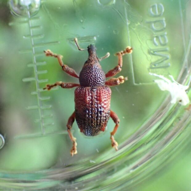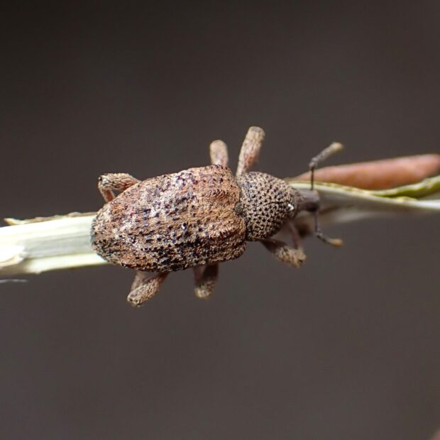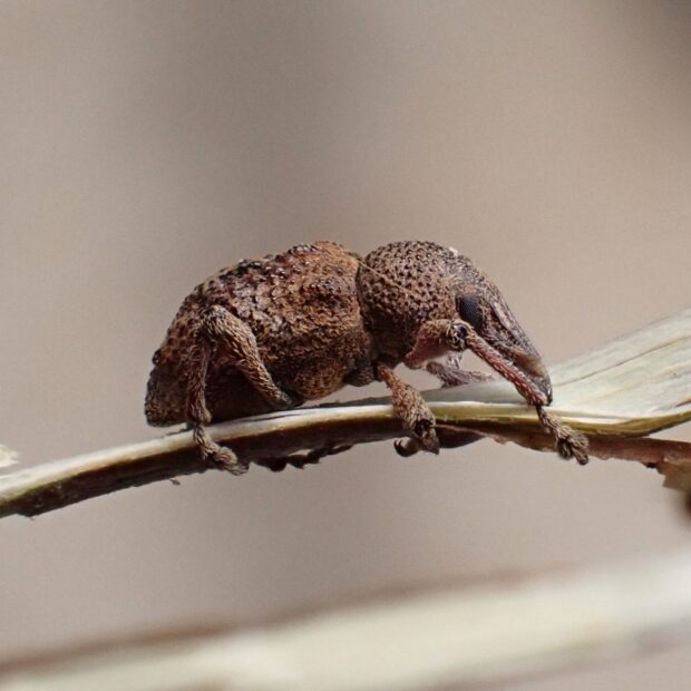 アナアキゾウムシの仲間。 体はゴツゴツしており、 上翅にはコブがあります。 メスはドングリに穴をあけて卵を産み、 幼虫はドングリの中で育ちます。