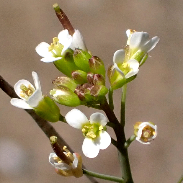 ヨーロッパ原産のアブラナ科の外来種で、 住宅地でもよく見られます。 白くて小さな花、 細長い果実、 丸みのある小さな葉が特徴です。