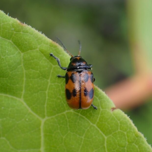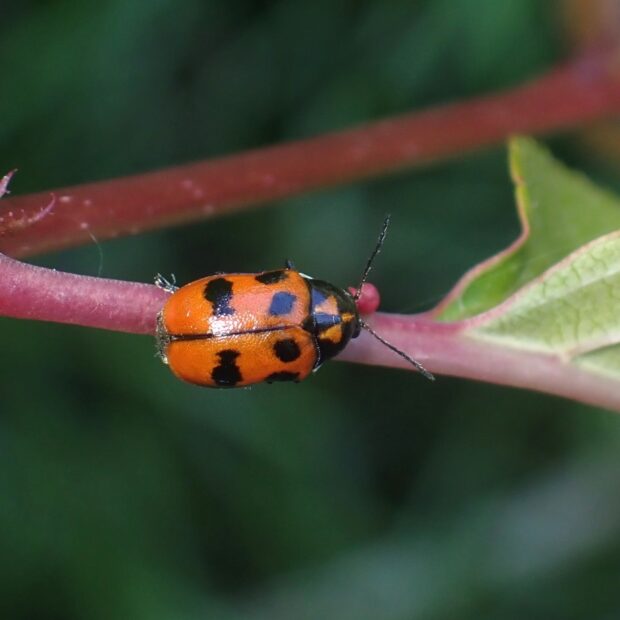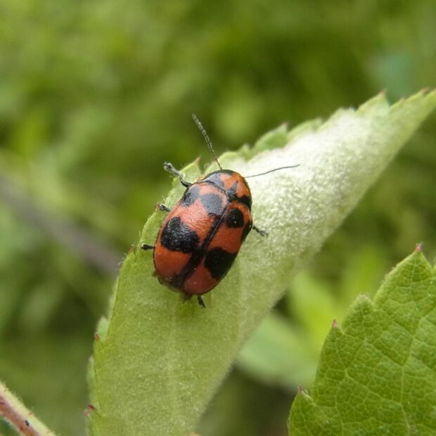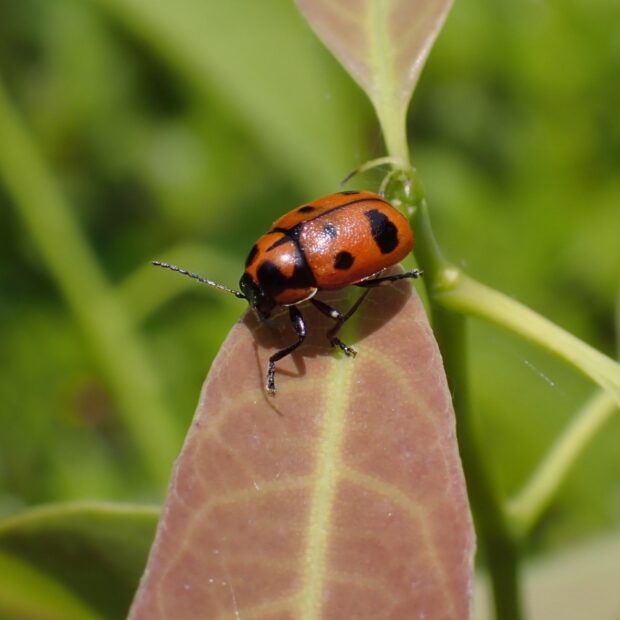 ずんどう体型(円筒形)のツツハムシの仲間。 赤い体に黒い模様があり、 テントウムシに擬態しているとのこと。 メスは産んだ卵をフンでくるみ、 地面にぽとっと落とします。 ふ化した幼虫は、 フンのケースの中で育ちます。