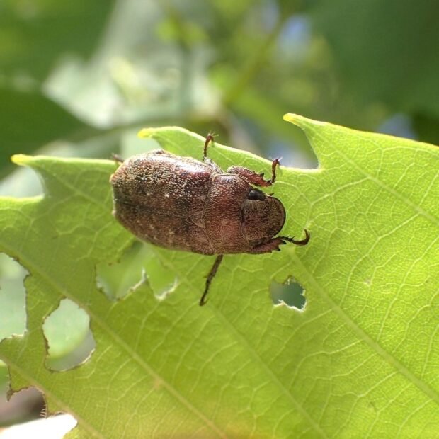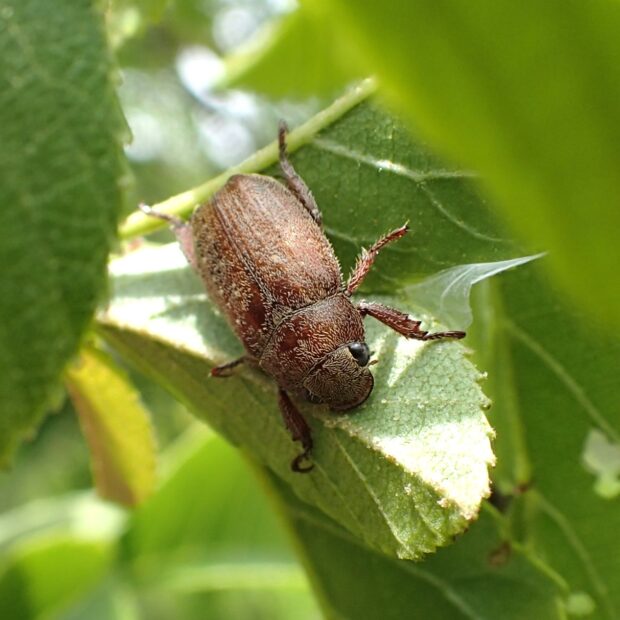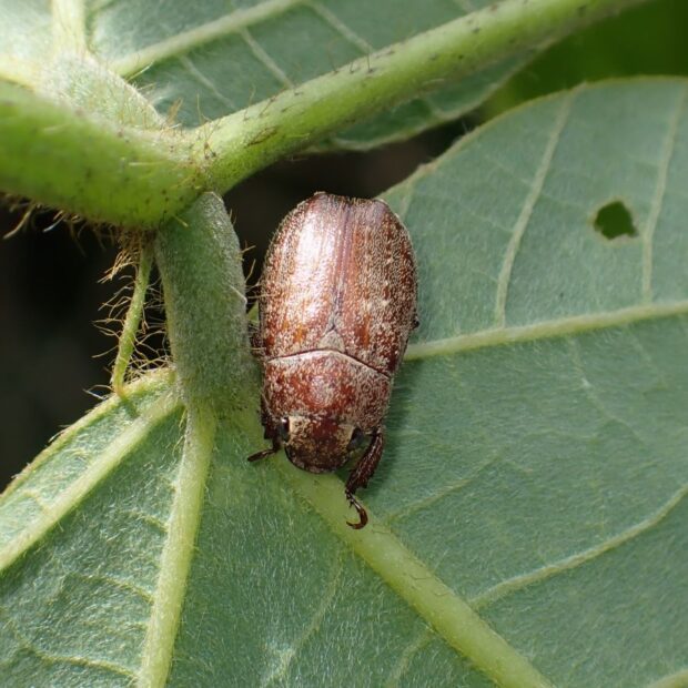 コガネムシの仲間。 市街地の公園などの樹木で普通に見られ、 明かりにやって来ます。 茶色の体は灰黄色の短い毛でおおわれ、 大きな黒い複眼を持ちます。 かつてはチャイロコガネと呼ばれていました。