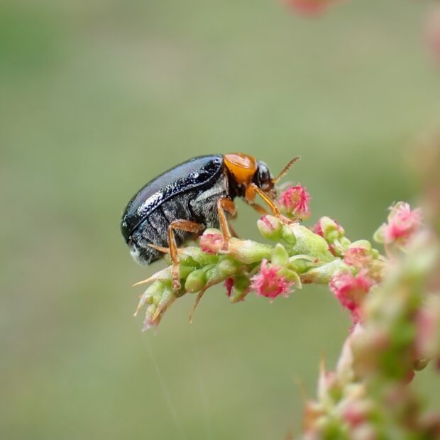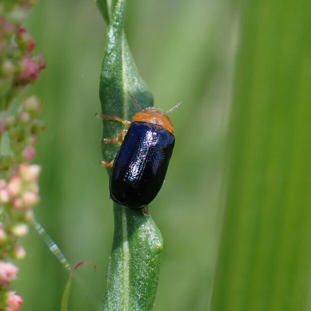 ハムシの仲間。 上翅は青藍色で、 前胸は透明感のあるオレンジ色です。 別名ムナキナガツツハムシ。 メスは産んだ卵をフンでくるみ、 ふ化した幼虫は、 フンのケースの中で育ちます。