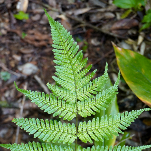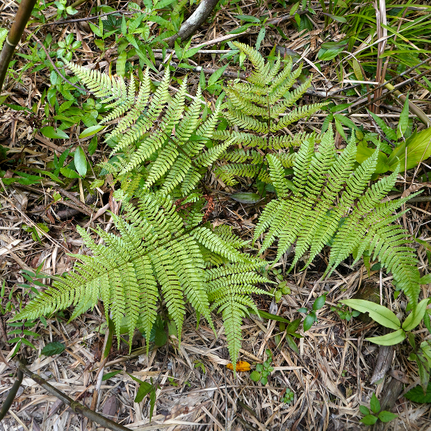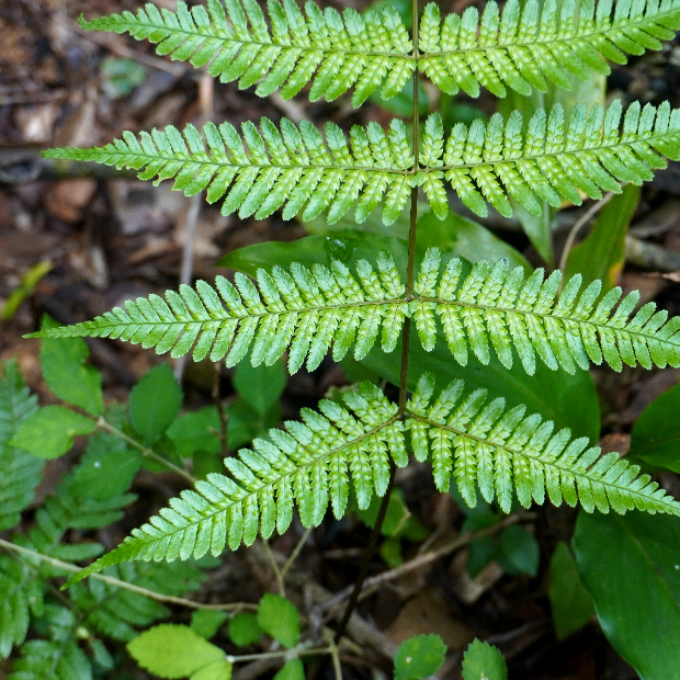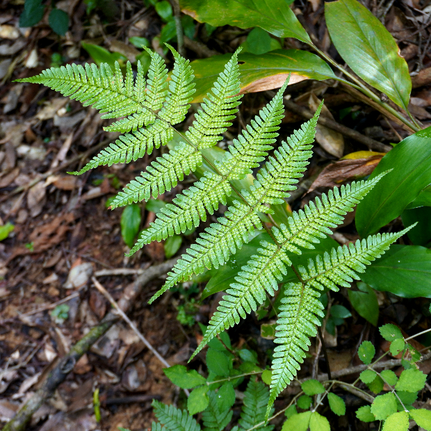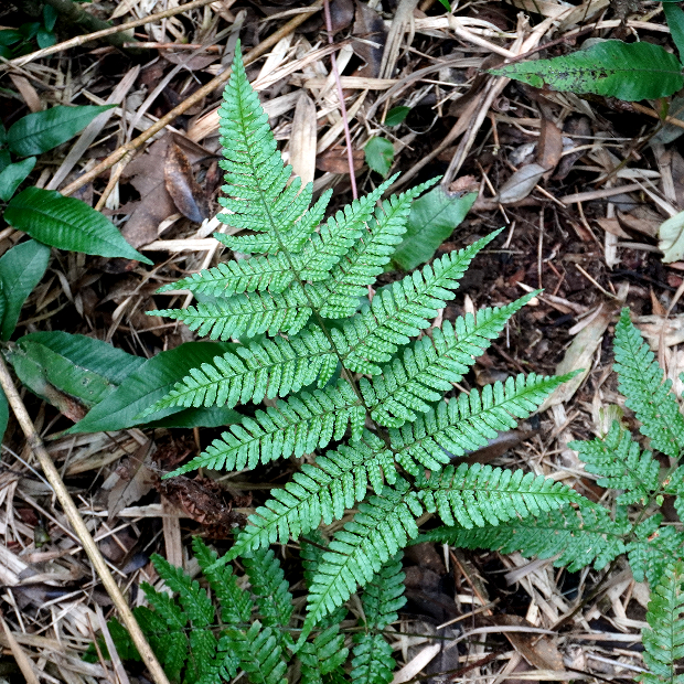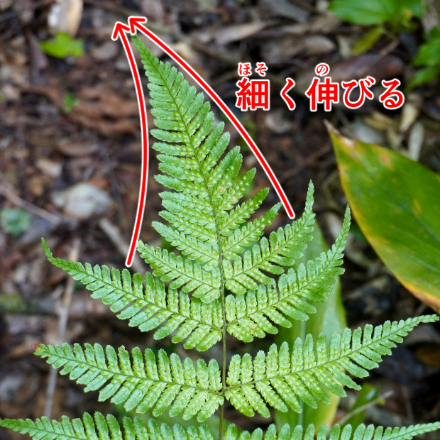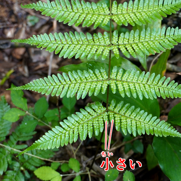最下羽片の葉軸に接する下向き小羽片が明らかに小さくなる。 ベニシダやハチジョウベニシダと同じ特徴。