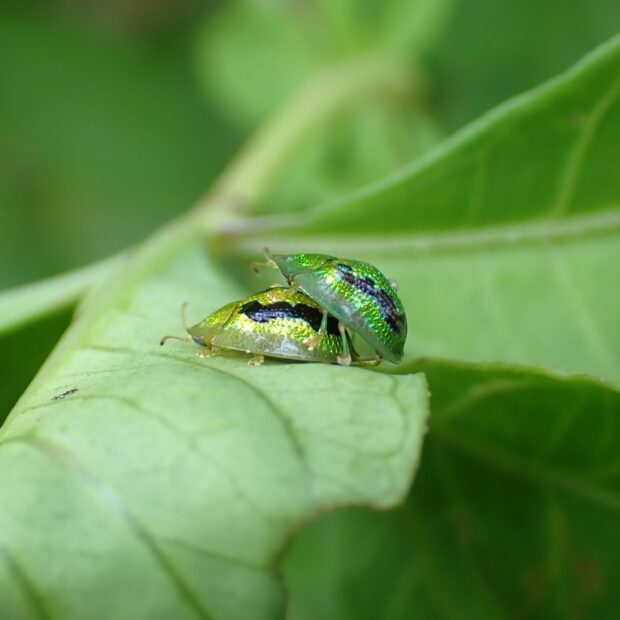 金緑色に輝く小さなカメノコハムシ