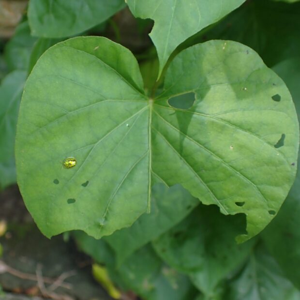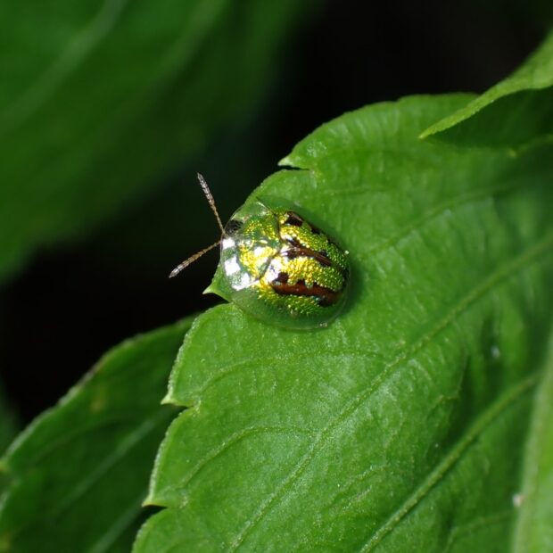 カメノコハムシの仲間。 金緑色で黒や褐色のU字の模様がありますが、 模様がないものもいます。 南西諸島などで普通に見られる南方系の昆虫ですが、 日本各地に広がりつつあり、 近年千葉県でも発見されました。