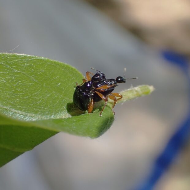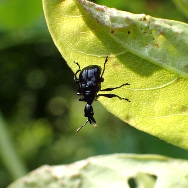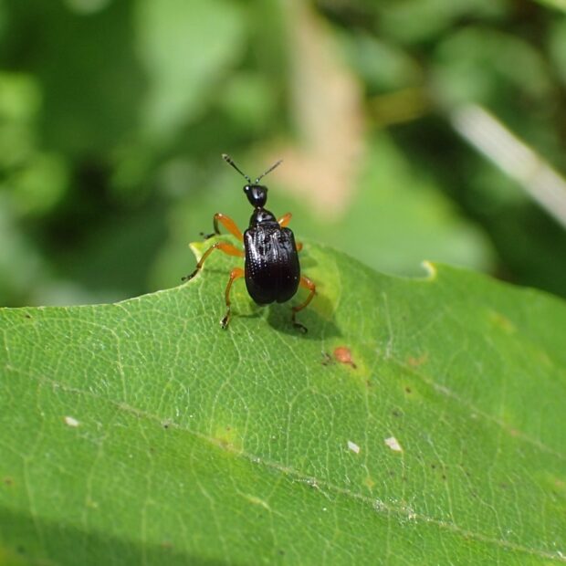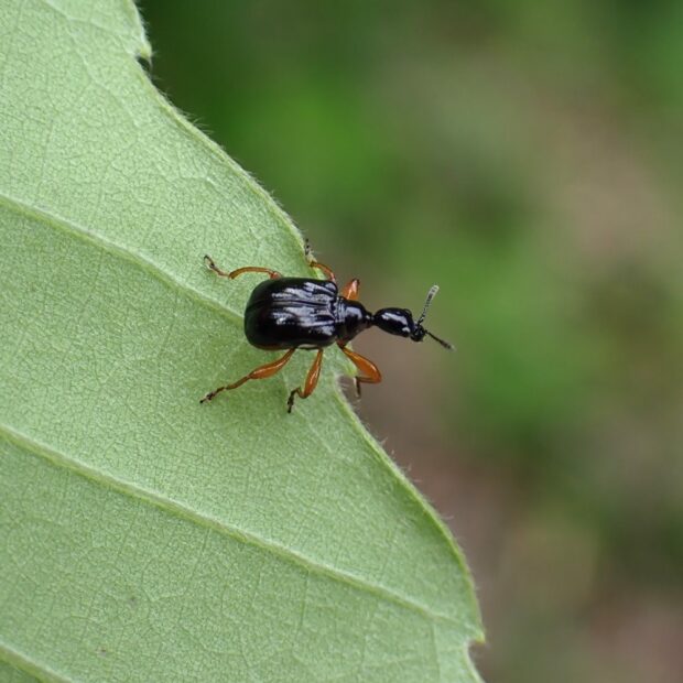 広葉樹の林縁で普通に見られるオトシブミの仲間。 メスは、 バラやコナラなど様々な木の葉を巻いて「揺籃(ようらん)」を作り、 その中に卵を産みつけます。 ふ化した幼虫は、 揺籃(巻いた葉)の中で育ちます。 地域により体色に変化があり、 黒色型、 黄腹型、 背赤型が見られます。