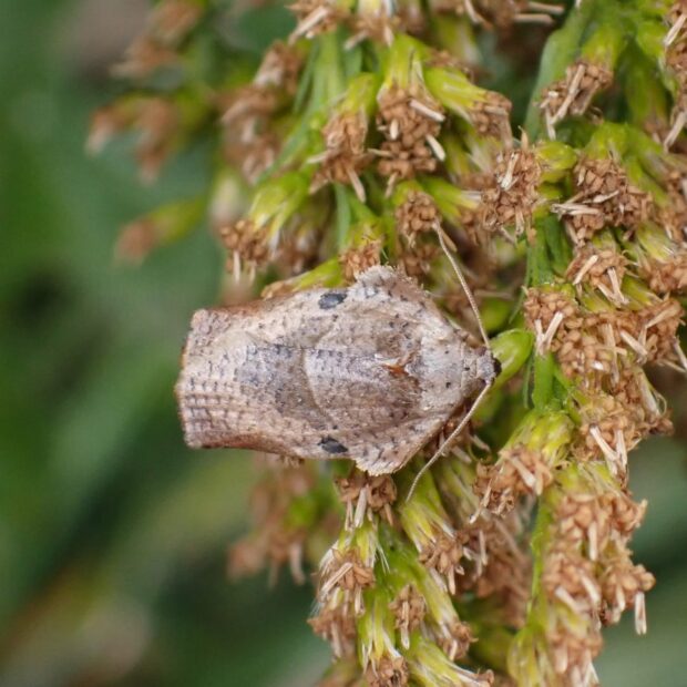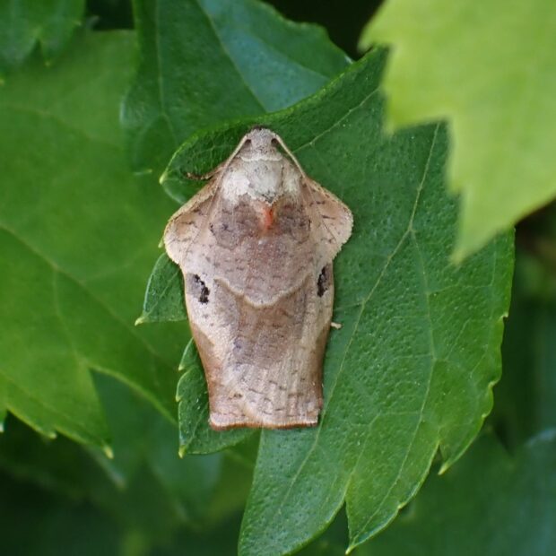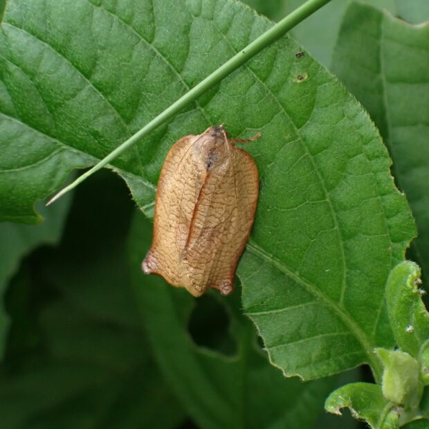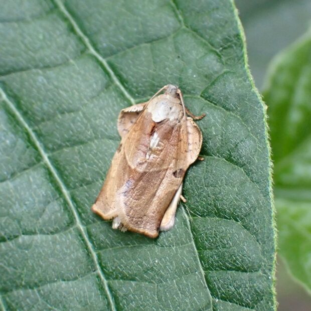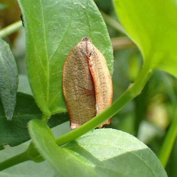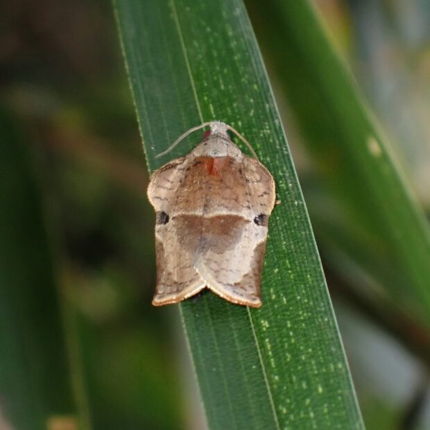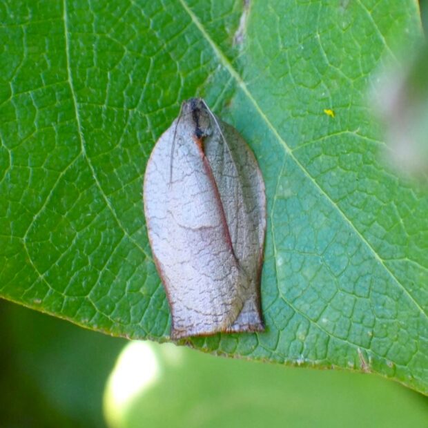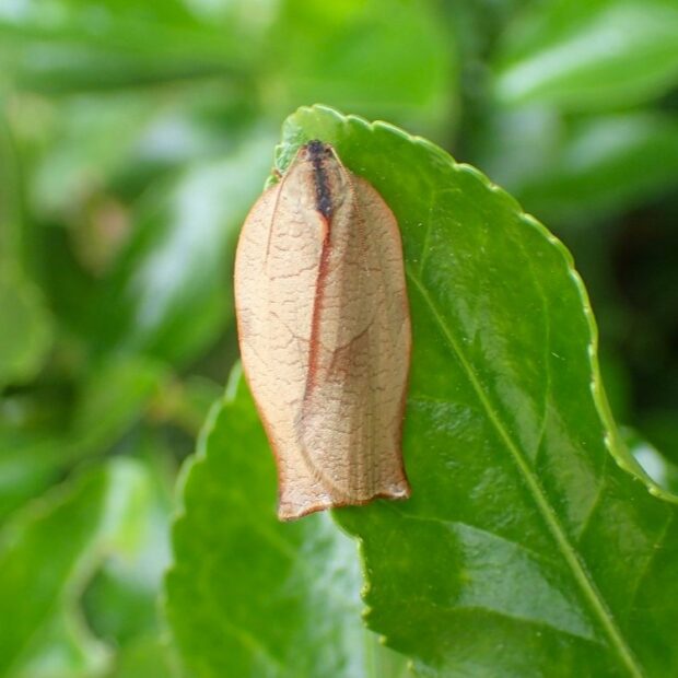 ハマキガの仲間。 オスとメスで姿が違い、 オスは前ばねには出っ張りのようなものがありますが、 メスにはありません。 幼虫は糸で葉をつづりあわせてその中を食べます。 茶の害虫と言われていますが、 何でも食べます。 幼虫越冬。