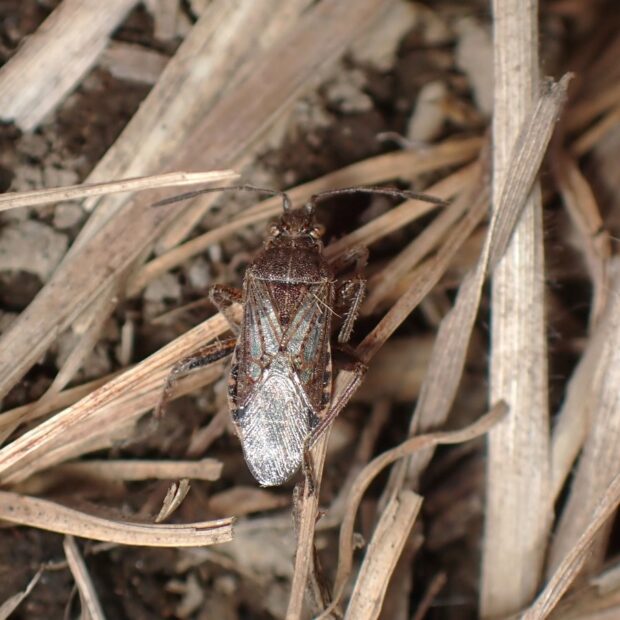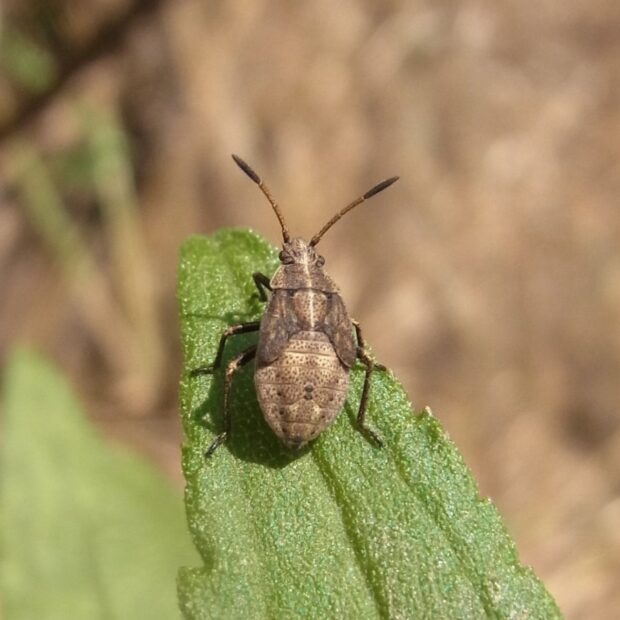 ヒメヘリカメムシの仲間。 前ばねは透明で、 腹部の後方に紋がある茶色のカメムシ。 草地や田んぼで見られます。