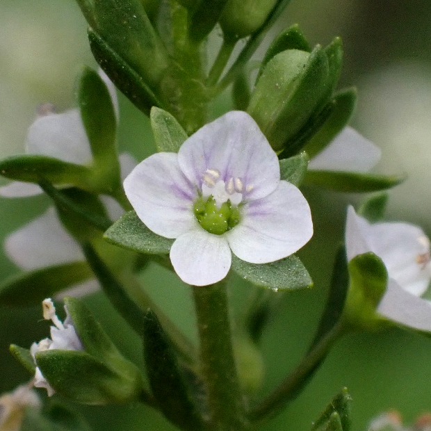 特定外来生物のオオカワヂシャは、 花がより大きくて紫色が強く、 ガクが正面から見えない。 両者の雑種のホナガカワヂシャは中間的。