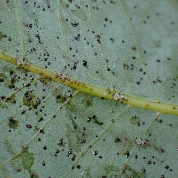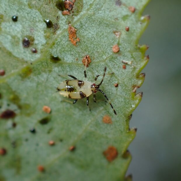ヤナギの葉で見られるグンバイムシの仲間。 体は淡褐色で前ばねには黒褐色の不明瞭な紋があります。 グンバイとは、 相撲の行司が持っている軍配のことで、 形が似ていることから名づけられました。