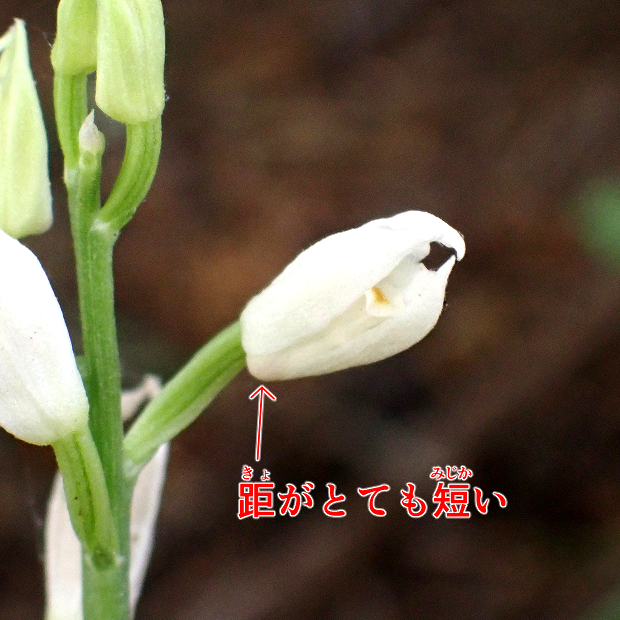 より普通に見られるギンランが似ています。 ギンランはより株が小さくて、 距が長く、 花があまり変色しないことが特徴ですが、 時に区別しにくいものも見られます。