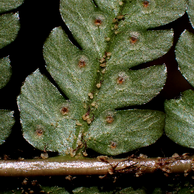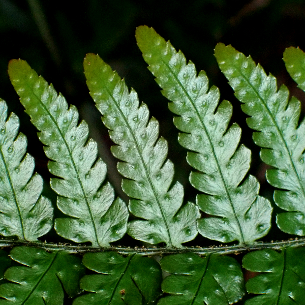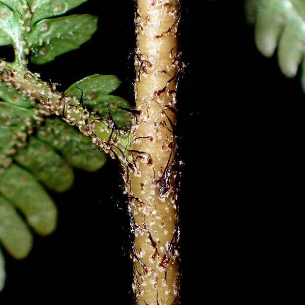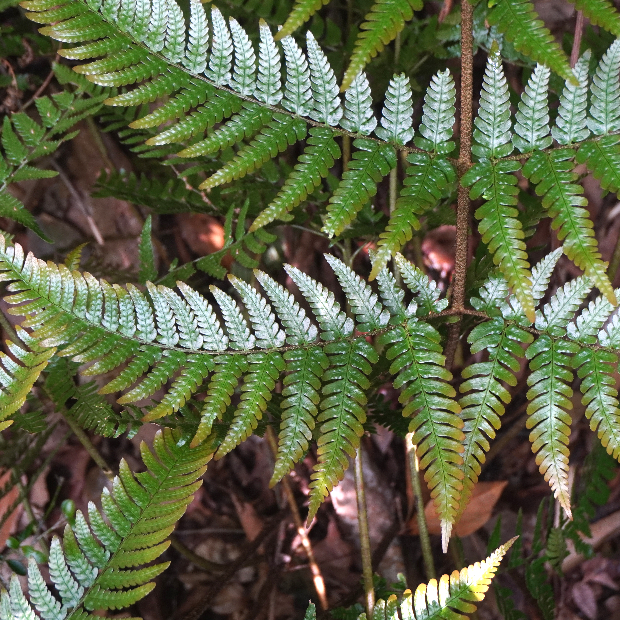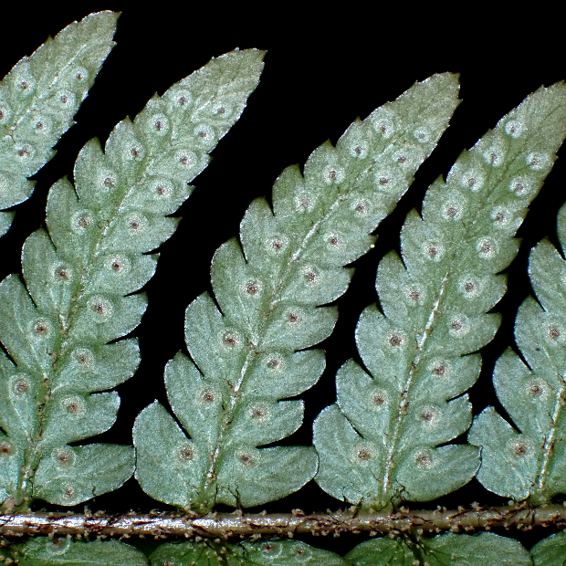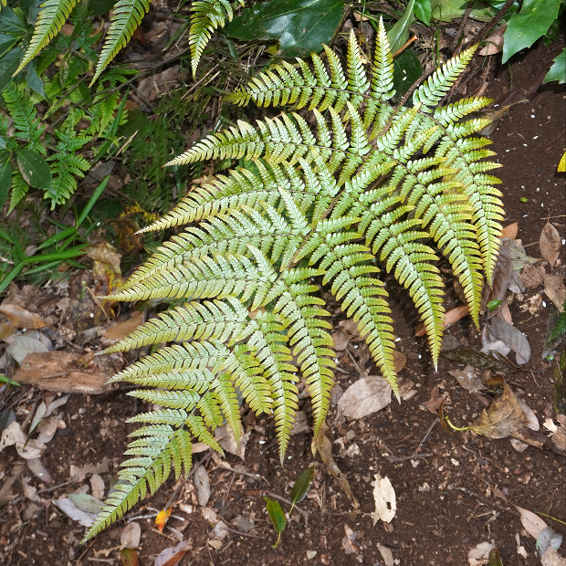 本種はオオイタチシダとハチジョウベニシダの雑種起源で遠い昔に生まれたと考えられているシダです。 葉は質が薄めで平面的、 包膜が紅色のことがある、 葉裏の胞子のう群が表に浮き出るなどベニシダっぽさを受け継いだ特徴がいくつか見られます。