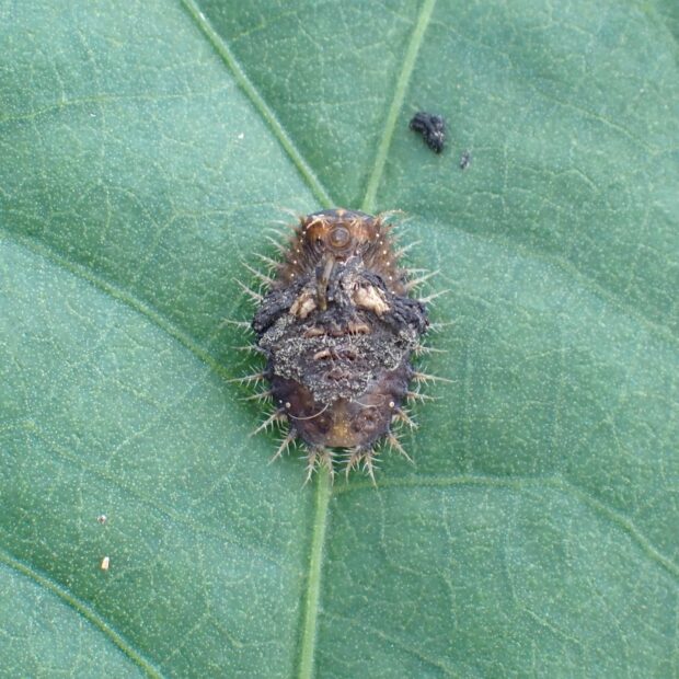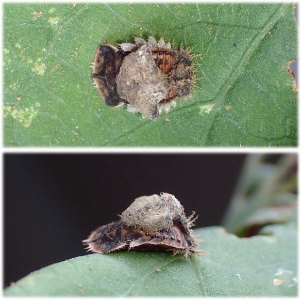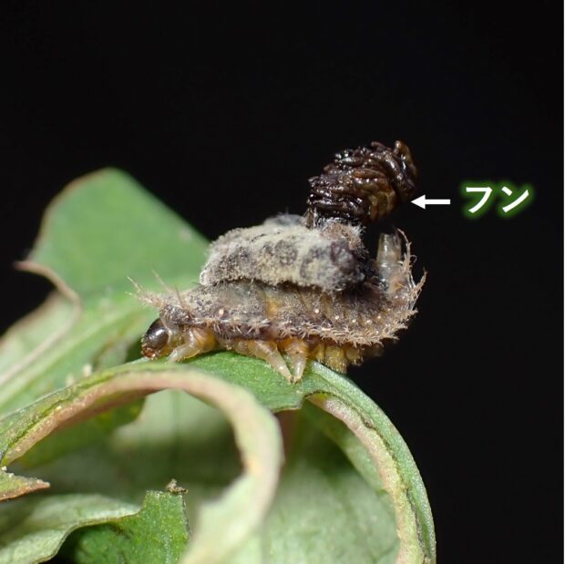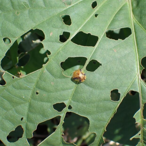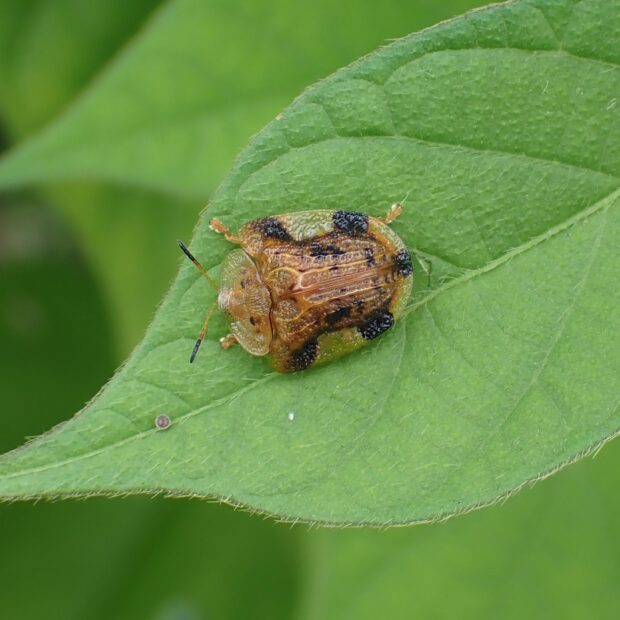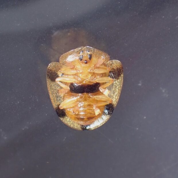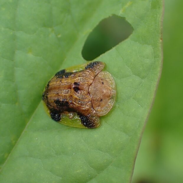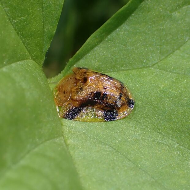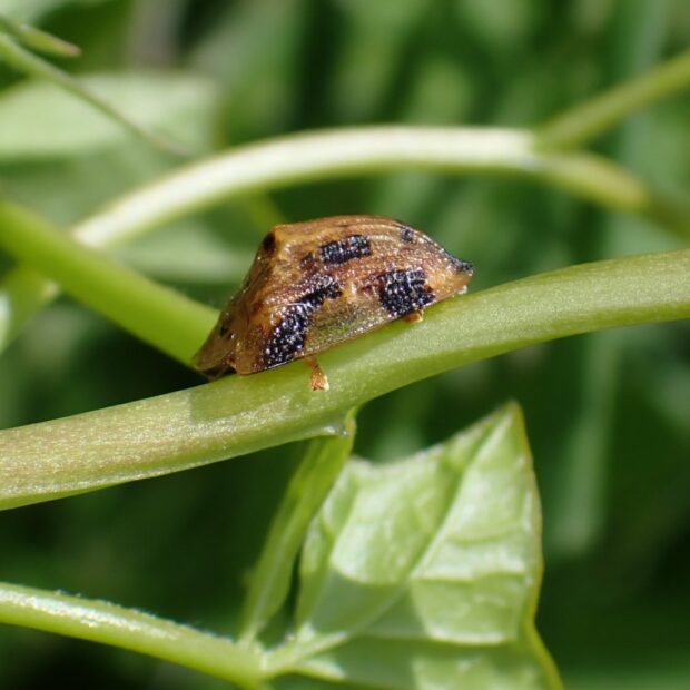 サツマイモやヒルガオなどを食べるカメノコハムシ。 4つの大きな黒い紋が目立つことから、 「ヨツモン」と名づけられました。 日本では元々は沖縄にいましたが、 近年分布を広げ、 関東地方で普通に見られるようになりました。