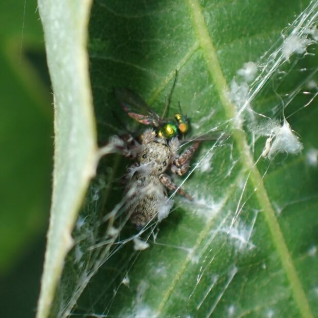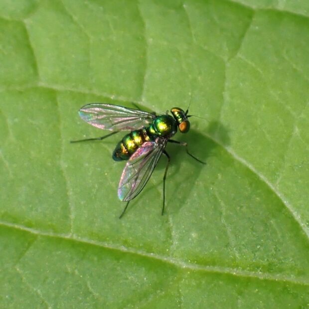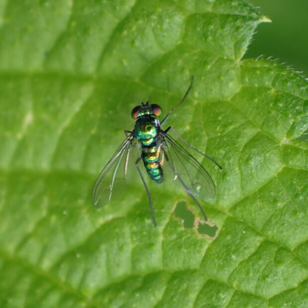葉の上でよく見られる小さなアシナガバエ。 体は金属光沢のある緑色ですが、 赤みがあるものもいます。 オスの前あしふ節には毛が密集しており「ウデゲ」と名づけられました。 似ている種が多く、 識別には注意が必要。