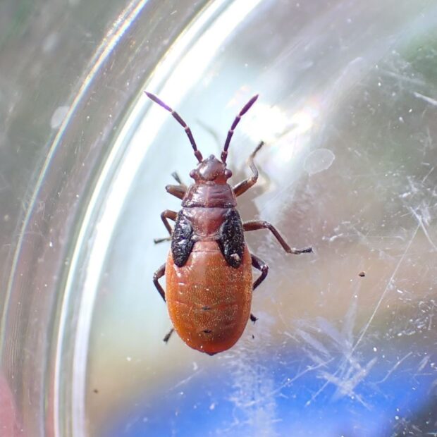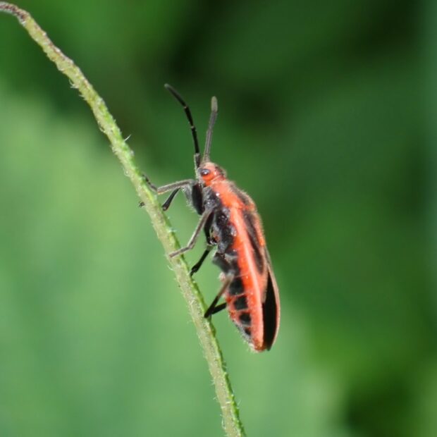 ボタンヅルを食べる赤と黒のマダラナガカメムシの仲間。 マダラナガカメムシ科は、 他にも赤と黒の鮮やかな色彩ものが多く、 模様の違いに注目しましょう。