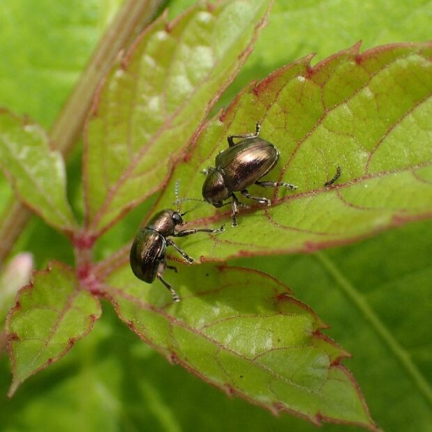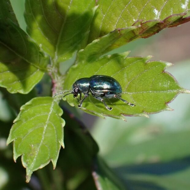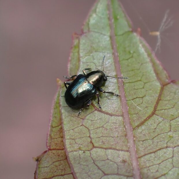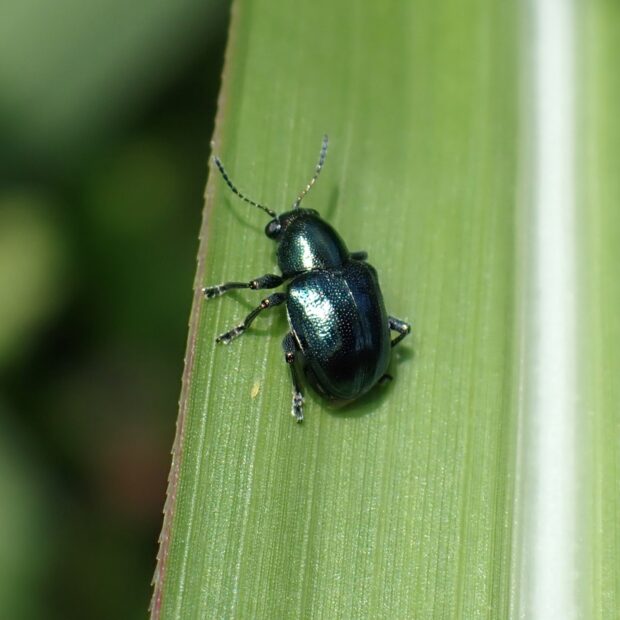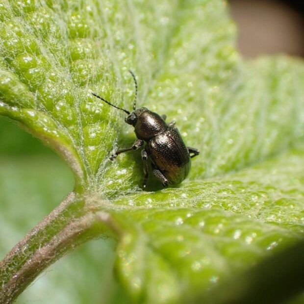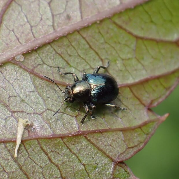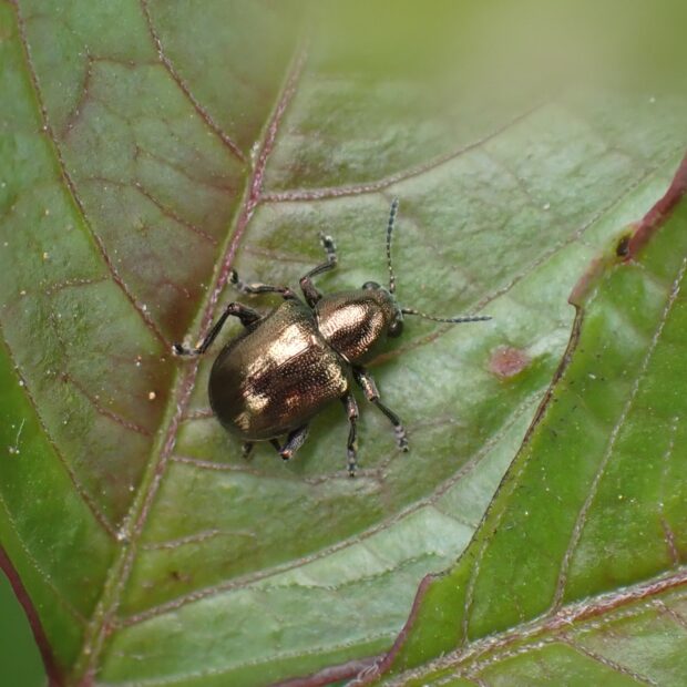 サルハムシの仲間。 体は小さく、 金属光沢のある銅色をしていますが、 変異があり青色のものもいます。 ヤブガラシなどの葉や茎を歩き回っている姿を普通に見ることができます。
