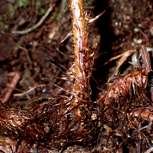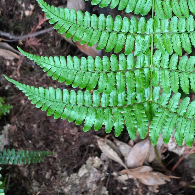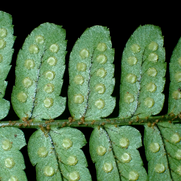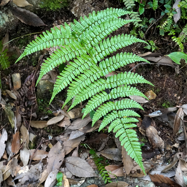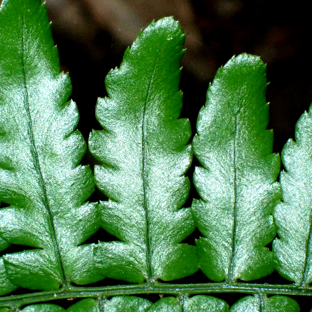 最下羽片の葉軸に接する下向き小羽片は、 となりの小羽片より小さい。