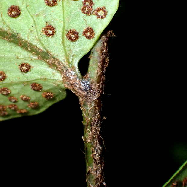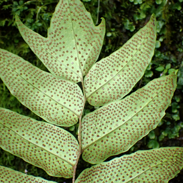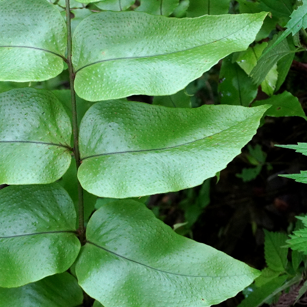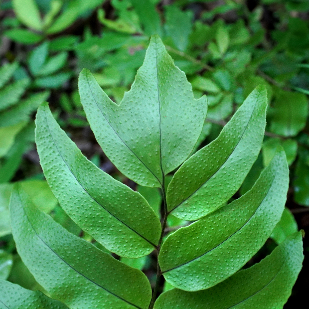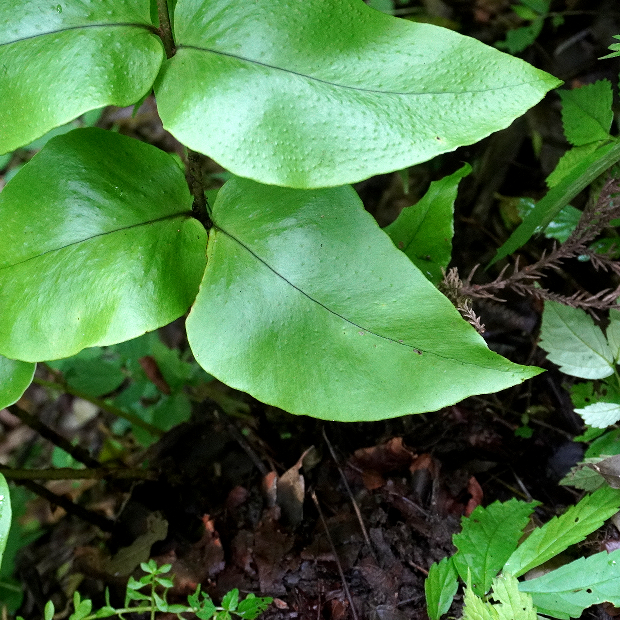 人里から離れた、 じめじめとした森に生えるシダ。 羽片は下のものほどヤブソテツより大きく丸くふくらんだ形をしていて、 その数は3~8対ほどと少なめです。 また、 頂羽片も大きくて目立ちます。