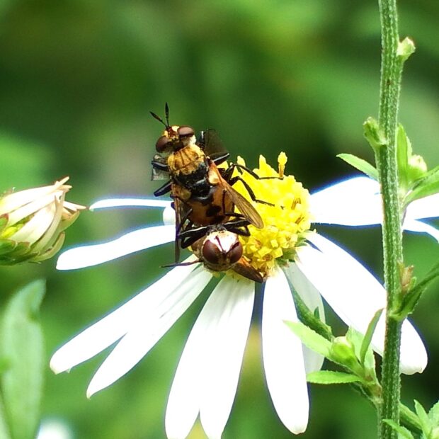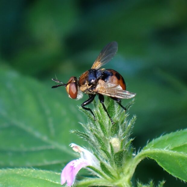 カメムシの仲間に寄生するヤドリバエの仲間。 別名マルボシヒラタハナバエ。 花によくやって来ます。 メスはカメムシの体に卵を産み、 ふ化した幼虫はカメムシの体の中で育ちます(内部寄生性)。