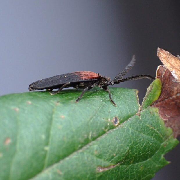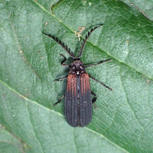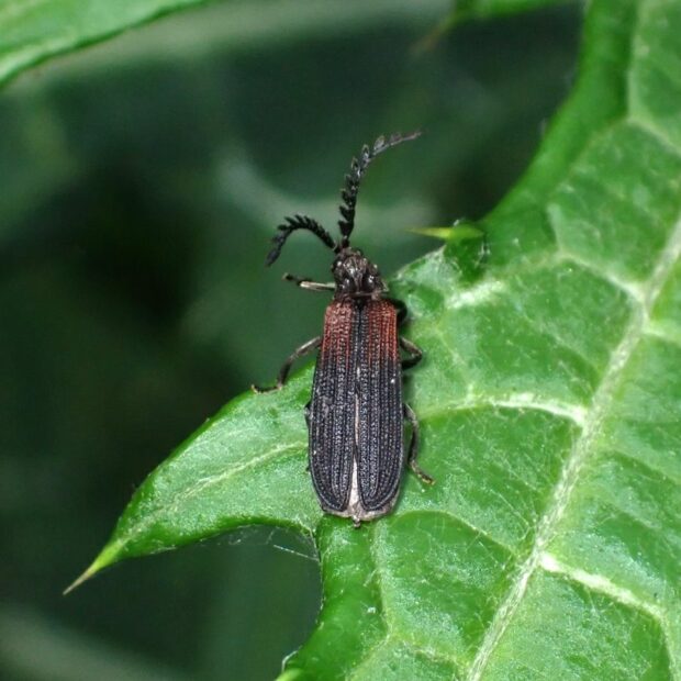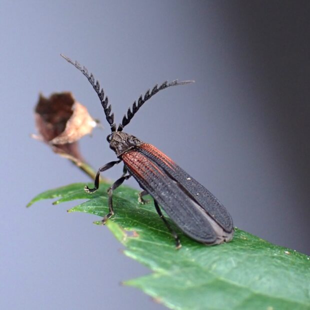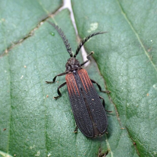 ベニボタル科ヒシベニボタルの仲間。 上翅(じょうし)は黒色で、 基部の方が赤色、 前胸は複雑な凸凹があります。 ベニボタルの仲間は発光しません。