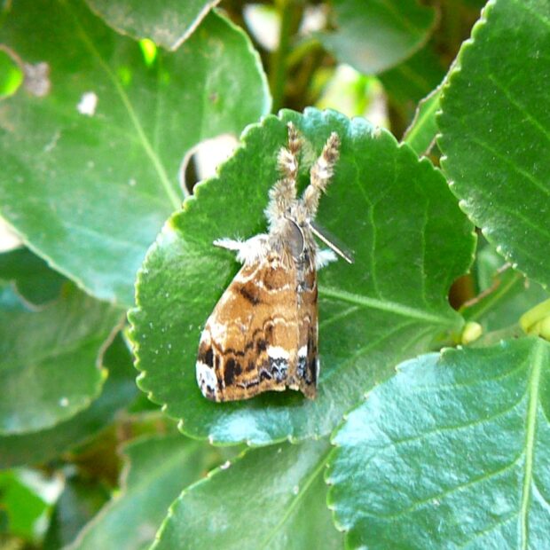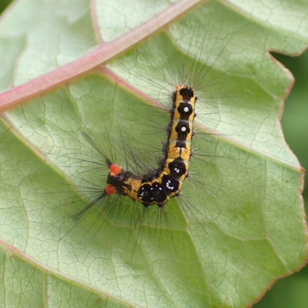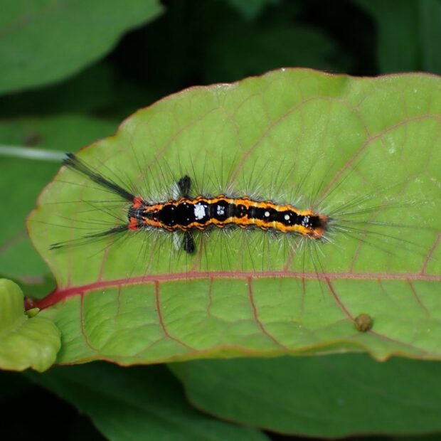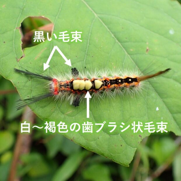 ドクガの仲間。 成虫はメスは白っぽく、 オスは茶色。 メスとオスで体色が違います。 終齢幼虫は白色~褐色の歯ブラシ状の毛束があり特徴的です。 幼虫に毒はありません。