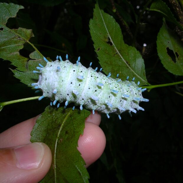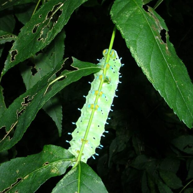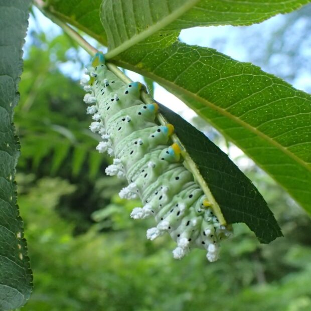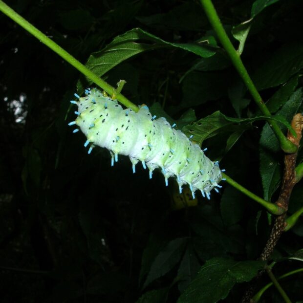 ヤママユガの仲間。 手のひらくらいの大きなガ。 すべてのはねに一つずつ三日月の模様があり、 古くは「ミツキムシ」と呼ばれていました。 幼虫がニワウルシ(別名シンジュ)を食べることから名づけられましたが、 いろいろな広葉樹の葉を食べます(広食性)。