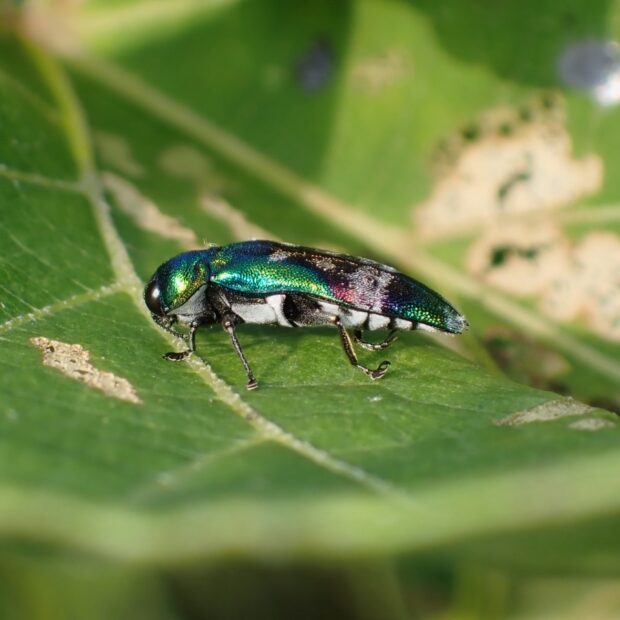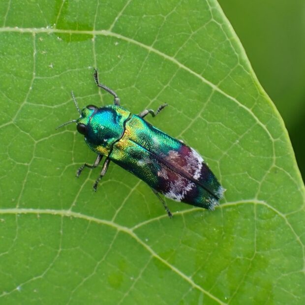 ナカボソタマムシの仲間。 アカメガシワの葉の上でよく見られます。 見る角度により、 緑、 青、 金色、 赤紫色と色の変化が見られ、 とても美しいです。
