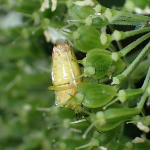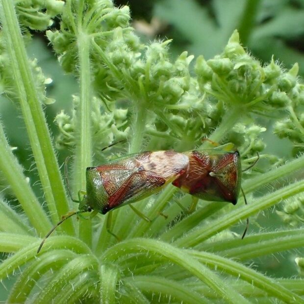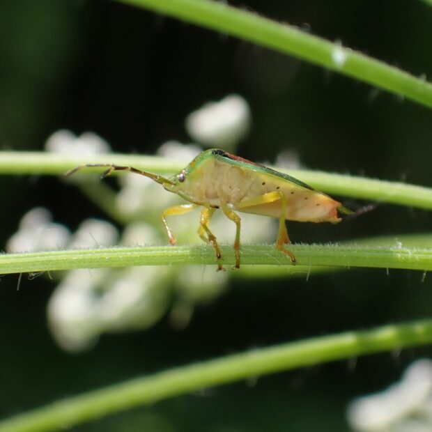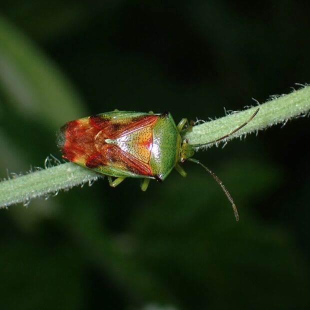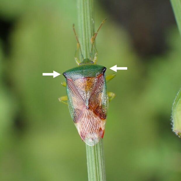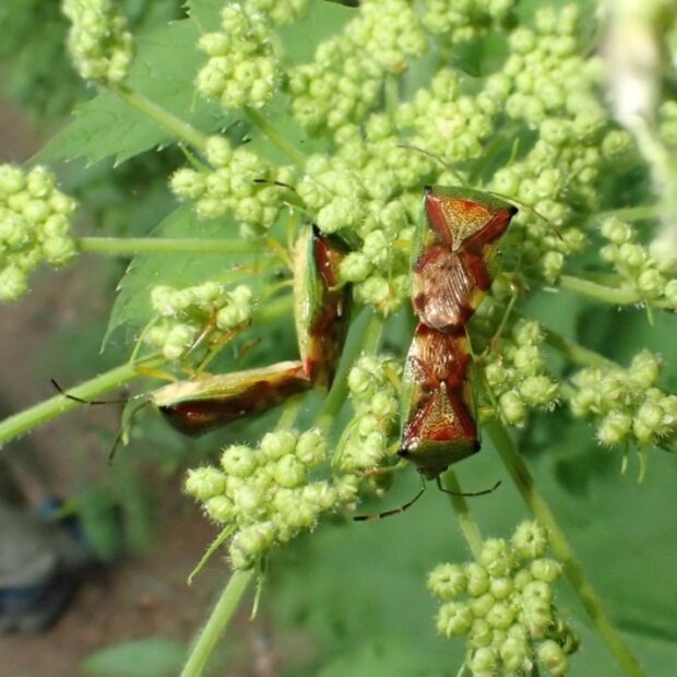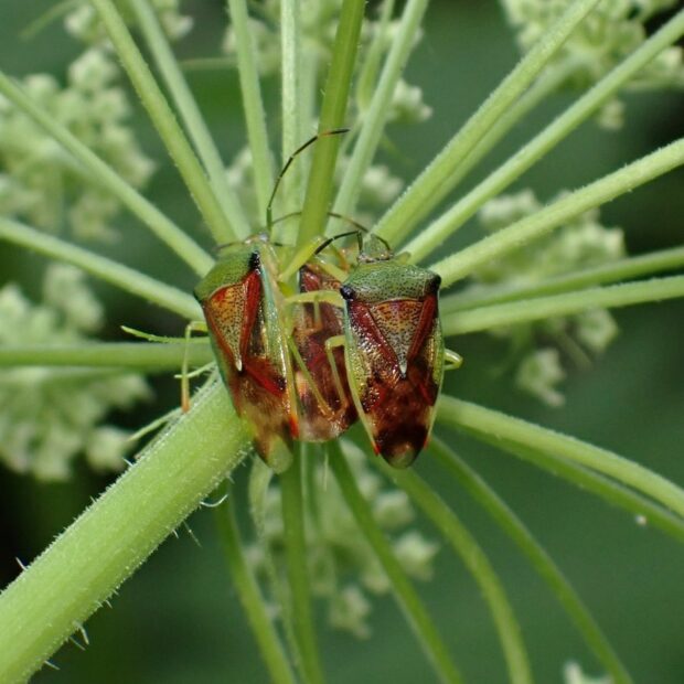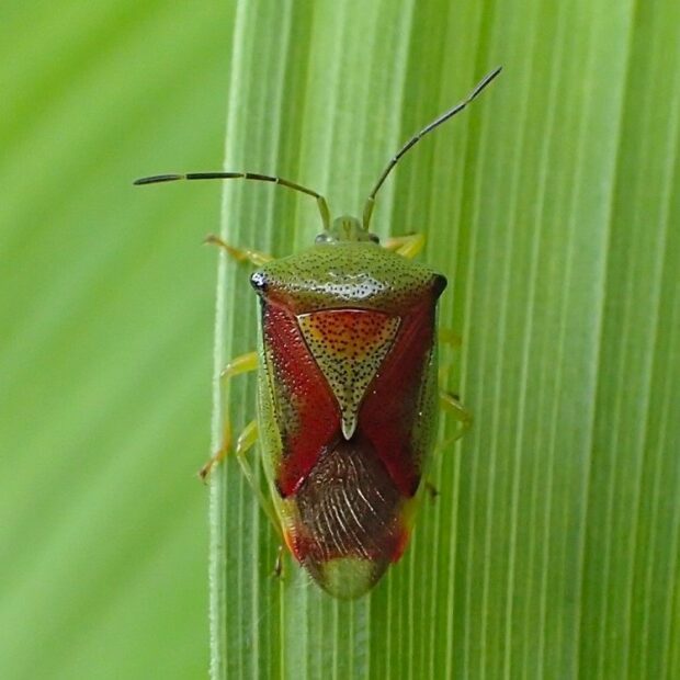 山のセリ科植物の花などで見られるツノカメムシ。 緑色の地色に、 背面の大部分が赤色です。 ツノカメムシの仲間は、 前胸の両側(側角)が突出するものが目立ちますが、 これはあまり突出しません。