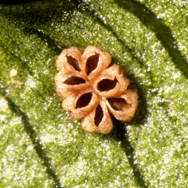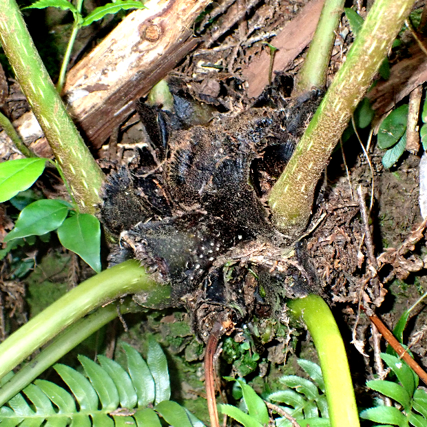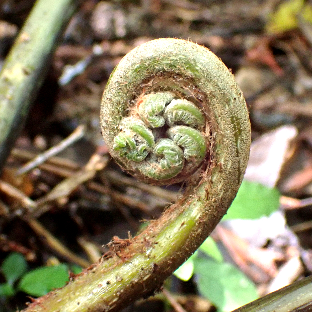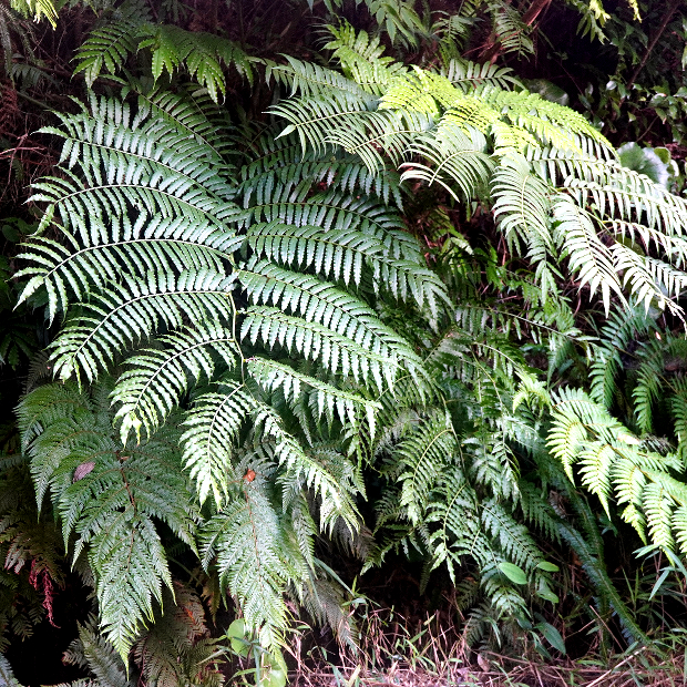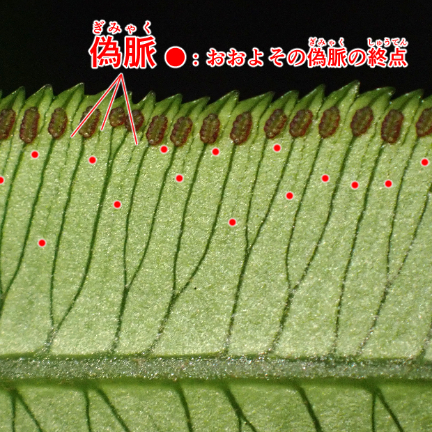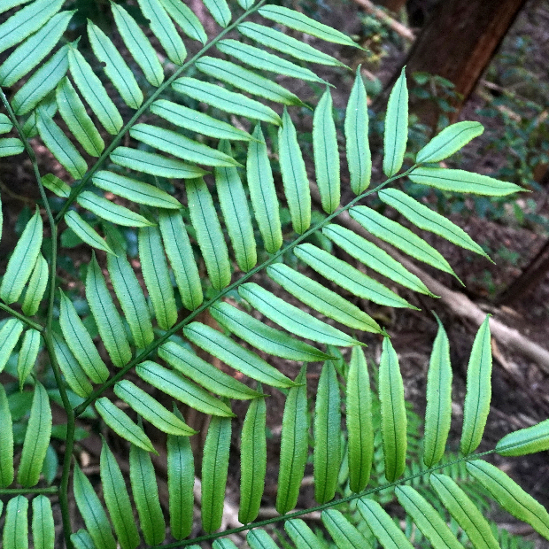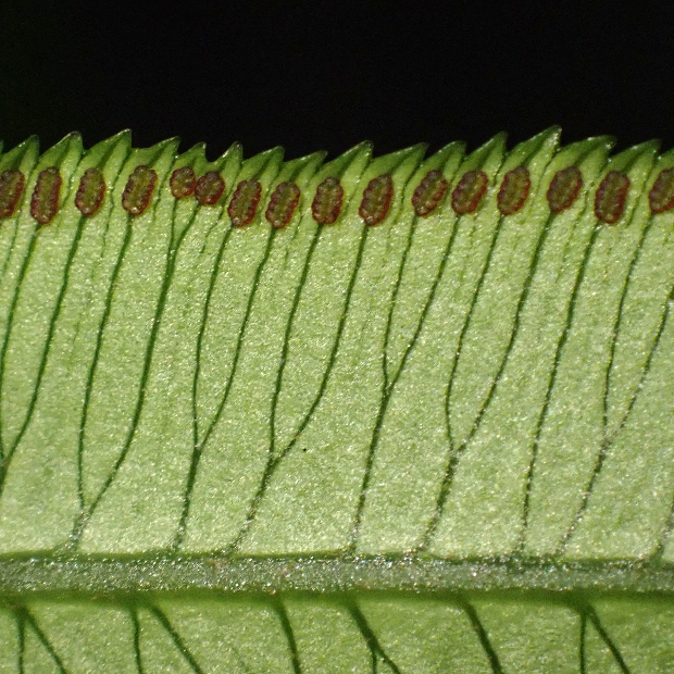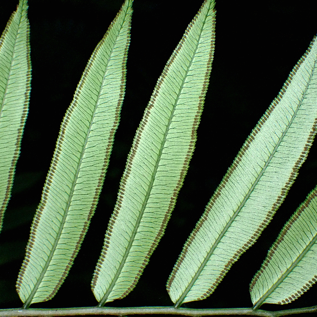 亜熱帯を代表する大きなシダ。 小羽片を多数つけた羽片を横方向に大きく広げます。 葉裏には厚く固い胞子のう群が脈沿いにつき、 葉柄基部には竜のウロコのような黒い托葉がつきます。