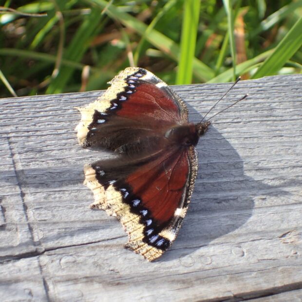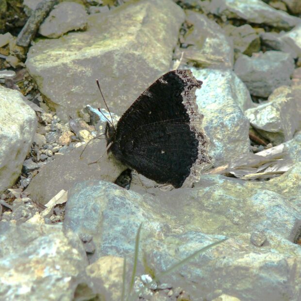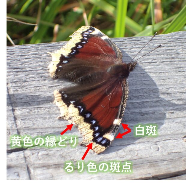 黄色い太いふちどりがある茶色いタテハチョウ。 本州では山岳地帯(1,000m以上)、 北海道では平地~山で見られます。 花に来ることはなく、 敏速に跳びます。 8月頃発生し、 そのまま成虫で越冬します(寿命は長く11か月ほど)。 アメリカではその姿から「喪服の外套(Mourning Cloak)」とよばれています。