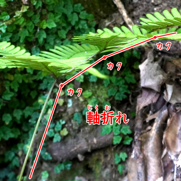 羽片ごとに折れ曲がっている。 これを軸折れという。