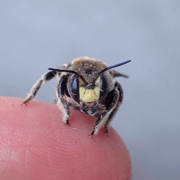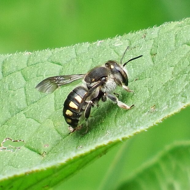 ハキリバチ科(あるいはミツバチ科)。 メスは腹部第1~5節に5対の黄色の紋(10個)があり「トモン」と名づけられました。 オスは第6節にも紋があり12個の黄色い紋があります。 真夏に現れ、 竹筒などのあなにヨモギなどの毛で巣を作ります。