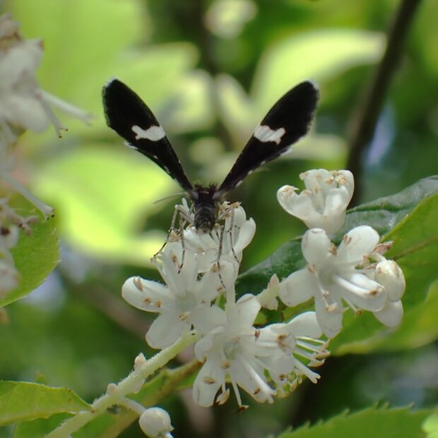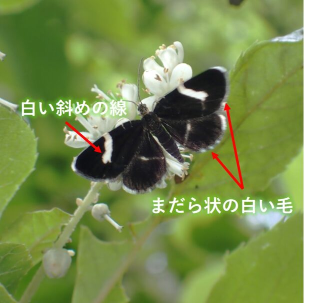 山で見られる昼行性のガ。 沢沿いの林道などで、 昼間にヒラヒラとよく飛び、 花を訪れます。 黒色のはねに白い帯や模様が特徴的ですが、 個体変異が大きいです。