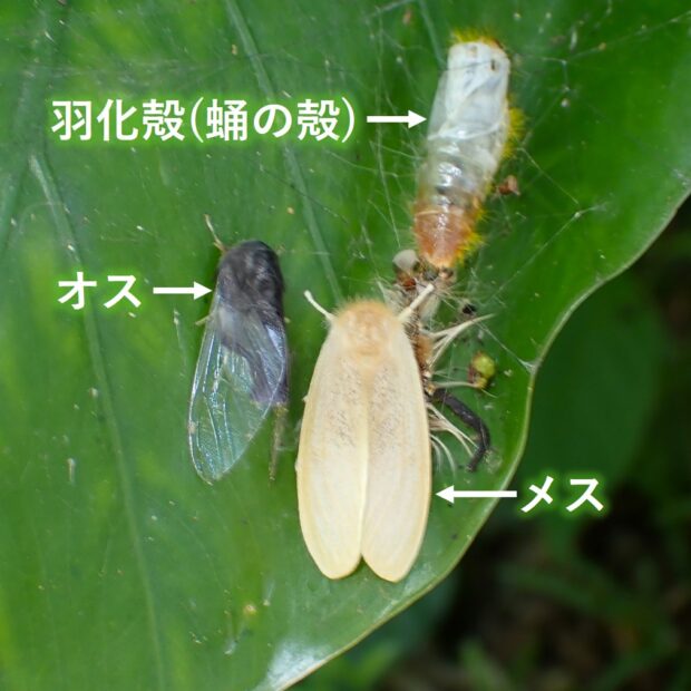沖縄で普通に見られるドクガの仲間。 オスとメスで色が違います。 オスの体は黒く、 はねに鱗粉はなく透明、 メスはやや大きく白っぽい鱗粉があります。 「スキバ」は透翅のことで、 オスの透明なはねをさします。 オスは昼行性です。