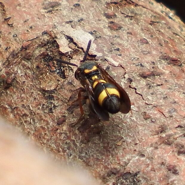 シリアゲコバチ科の仲間で、 本土ではシリアゲコバチとオキナワシリアゲコバチが見られます。 オキナワシリアゲコバチの産卵管(鞘)は短く、 腹の中ほどまでしかありません。 木の中で育つハチの幼虫や蛹に卵を産みつける寄生バチ。