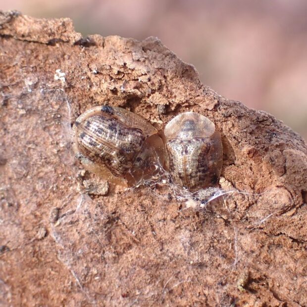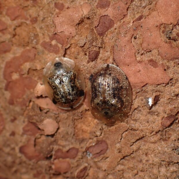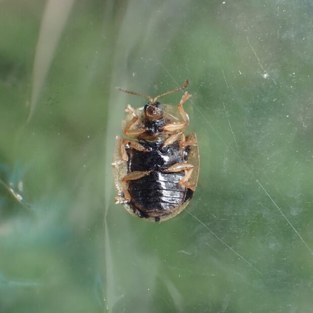 草地で見られるカメノコハムシの仲間。 アカザやイヌビユなどで見られます。 上翅後方の半透明の部分の両側に黒い紋があります。