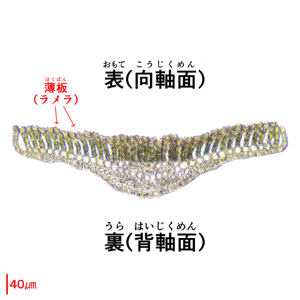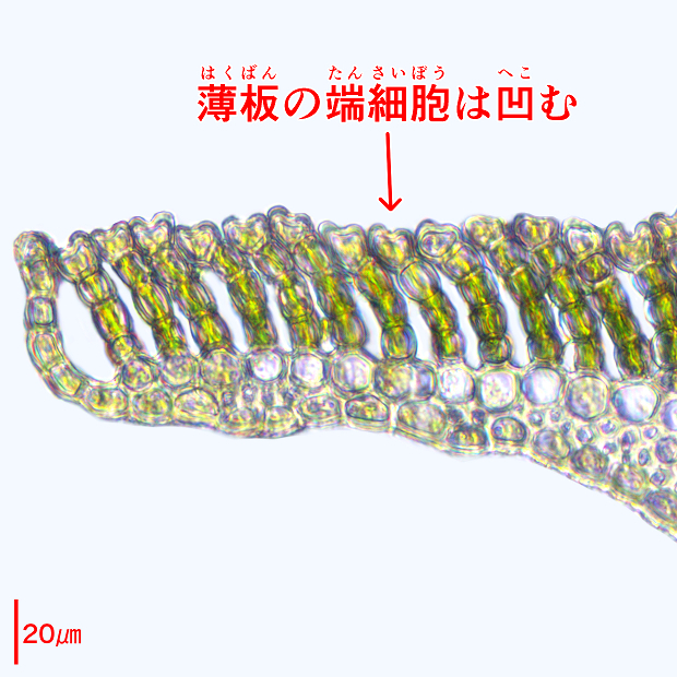 表側には高さ数細胞になる板状の構造が連なっていて、 薄板という。 これの特徴がスギゴケ科を見分ける上で重要となる。